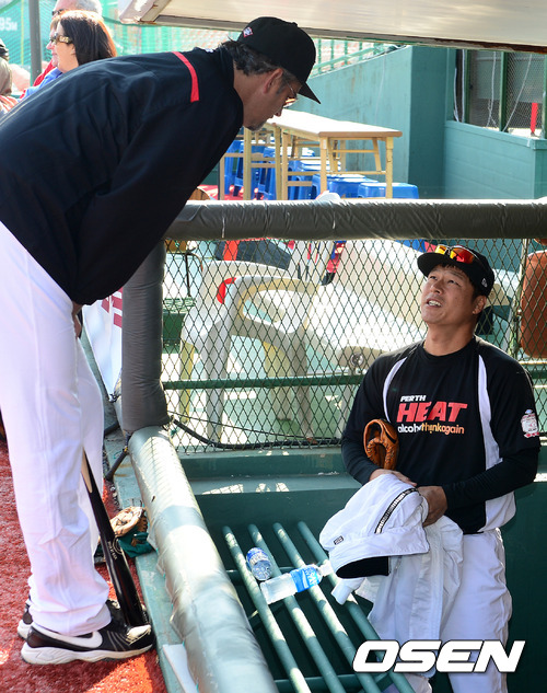 구대성이 코칭스태프와 이야기를 나누고 있다. '시드니 블루삭스'에서 뛰고 있는 구대성은 아시아시리즈 기간 동안 '퍼스 히트'로 임대됐다.