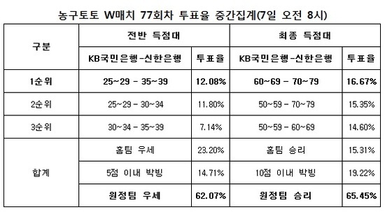 국민체육진흥공단(www.kspo.or.kr)이 발행하는 체육진흥투표권 수탁사업자인 스포츠토토 공식 온라인 발매사이트인 베트맨(www.betman.co.kr)이 오는 8일 오후 5시 청주 종합체육관에서 벌어지는 KB국민은행-신한은행 전 대상 농구토토 W매치 77회차 투표율을 중간 집계한 결과, 전체 참가자의 65.45%가 원정팀 신한은행의 승리를 예상했다고 밝혔다.