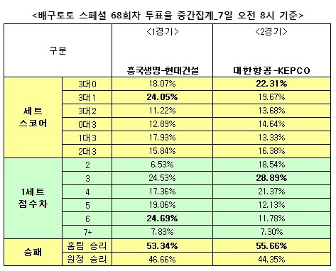 [배구토토] 국민체육진흥공단(www.kspo.or.kr)이 발행하는 체육진흥투표권 수탁사업자인 스포츠토토 공식 온라인 발매사이트 베트맨(www.betman.co.kr)이 오는 8일 열리는 2012-13시즌 국내프로배구(V리그)를 대상으로 한 배구토토 스페셜 68회차 투표율 중간집계 결과, 국내 배구팬 55.66%는 대한항공-KEPCO(2경기)전에서 대한항공의 승리를 전망했다고 밝혔다.