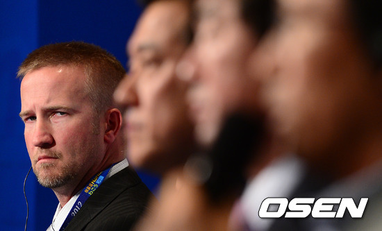 퍼스 스티브 피시 감독이 롯데 권두조 코치의 답변에 귀기울이고 있다.