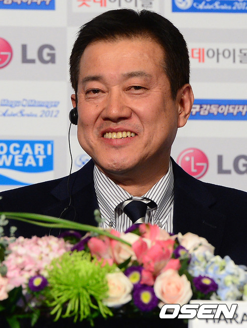 요미우리 하라 감독이 질문에 미소짓고 있다.
