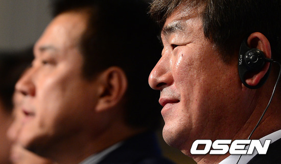 삼성 류중일 감독이 요미우리 하라 감독의 답변을 경청하고 있다.