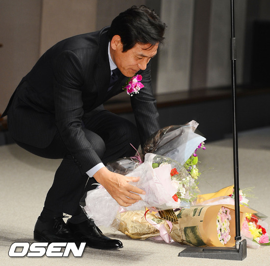 7일 오후 서울 프레스센터 국제회의실에서 열린 제32회 영평상 시상식에서 안성기가 남우연기상을 수상한 후 받은 꽃다발을 내려놓고 있다.