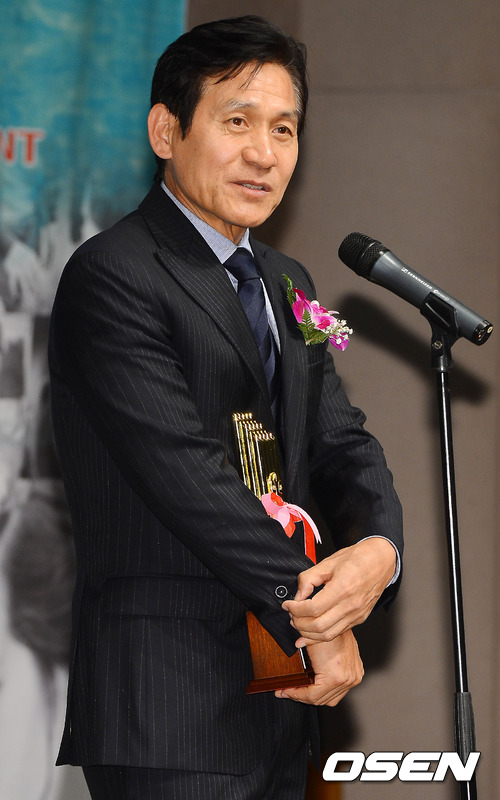 7일 오후 서울 프레스센터 국제회의실에서 열린 제32회 영평상 시상식에서 안성기가 남우연기상을 수상한 후 소감을 말하고 있다.