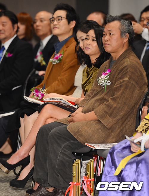 7일 오후 서울 프레스센터 국제회의실에서 열린 제32회 영평상 시상식에서 김기덕 감독과 조민수 김고은 김성균이 의자에 앉아 있다.