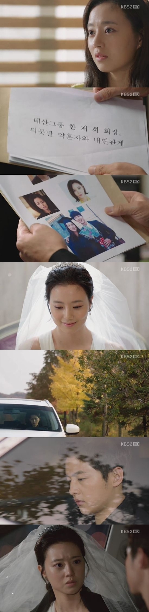 7일 오후 방송된 KBS 2TV 수목드라마 '세상 어디에도 없는 착한남자(이하 '착한남자')'에서는 마루(송중기 분)와 은기(문채원 분)의 결혼식이 시작되려던 시각 은기가 작성한 ‘태산그룹 한재희 회장, 의붓딸 약혼자와 내연관계’라는 제목의 서류가 언론사에 제보돼 마루와 재희(박시연 분)를 궁지로 내몰았다.