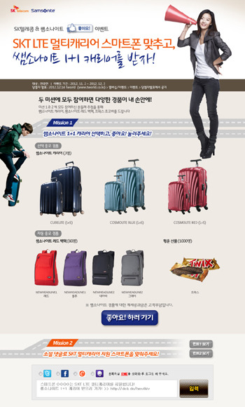 이번 이벤트는 오는 12월 2일까지 진행되며 쌤소나이트와 SK 텔레콤 페이스북에 ‘좋아요’를 누르고, SKT 멀티캐리어 서비스가 지원되는 스마트폰을 맞추는 두 가지 미션을 수행하면 추첨을 통해 쌤소나이트 1+1 캐리어를 받을 수 있다.