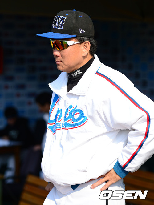 8일 오후 부산 사직야구장에서 열린 '마구매니저 아시아시리즈 2012' 라미고 몽키스와 차이나 스타즈의 개막전 경기, 경기에 앞서 라미고 몽키스 홍이중 감독이 훈련 중인 선수들을 바라보고 있다.
