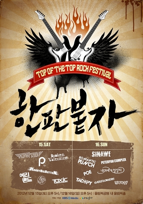 KBS미디어와 인사이트가 공동 주최하고 주관하는 ‘탑밴드’의 두 번째 공연 ‘TOP OF THE TOP ROCK FESTIVAL: 한판붙자’(이하 한판붙자)가 다음달 15일부터 이틀간 올림픽공원 내 올림픽홀에서 열린다.
