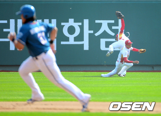 8일 오후 부산 사직야구장에서 열린 '마구매니저 아시아시리즈 2012' 라미고 몽키스와 차이나 스타즈의 개막전 경기, 1회초 2사 1,3루 라미고 구어이앤원의 타구를 차이나 야수진이 타구를 놓치고 있다. 구어이앤원은 선제 2타점 적시 3루타를 기록했다.