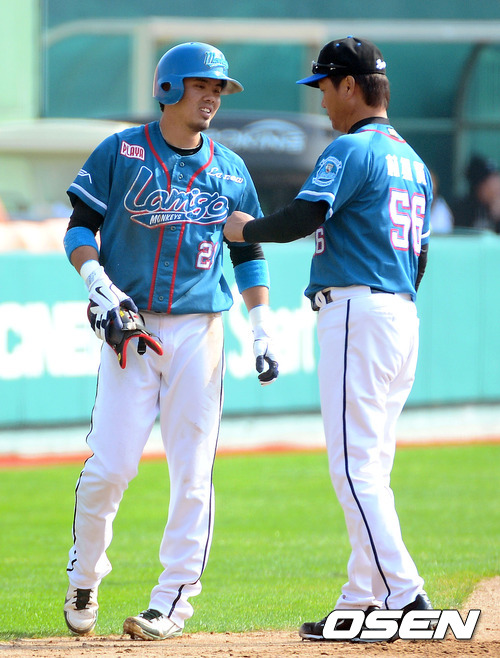 8일 오후 부산 사직야구장에서 열린 '마구매니저 아시아시리즈 2012' 라미고 몽키스와 차이나 스타즈의 개막전 경기, 1회초 2사 1,3루 라미고 궈옌원이 좌전 2타점 적시 3루타를 치고 환호하고 있다.