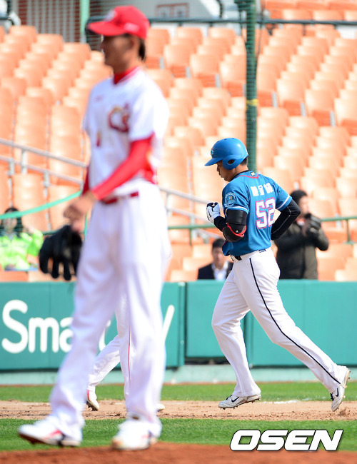 8일 오후 부산 사직야구장에서 열린 '마구매니저 아시아시리즈 2012' 라미고 몽키스와 차이나 스타즈의 개막전 경기, 3회초 무사 1,2루 라미고 천진펑이 중월 스리런홈런을 치고 그라운드를 돌고 있다.