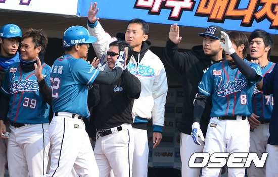 8일 오후 부산 사직야구장에서 열린 '마구매니저 아시아시리즈 2012' 라미고 몽키스와 차이나 스타즈의 개막전 경기, 3회초 무사 1,2루 라미고 천진펑이 중월 스리런홈런을 치고 더그아웃에서 동료들과 환호하고 있다.