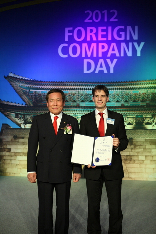 지식경제부 장관상을 대리 시상한 신박제 한국외국기업협회장(왼쪽)과 프랑크 차네츠키 대표.
