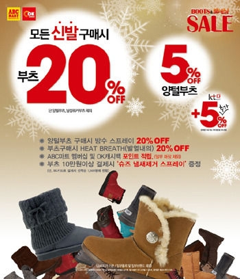 이 밖에 부츠를 구매하면 흡습 발열과 보온에 탁월한 발열내의 '히트브레스(HEATBREATH)’를 20% 할인해 주고, 11월 10일부터 BC카드로 10만원 이상 부츠를 결제한 1500명 선착순에 ‘슈즈 냄새 제거 스프레이’를 증정한다. 더불어 KT올레 클럽 회원은 5% 추가 할인, 최대 35% 할인혜택을 받을 수 있고, OK캐쉬백 제휴를 기념해 14일까지 전국적으로 시행 중인 ‘1,000포인트 행사’를 활용하면 OK캐쉬백 1,000포인트 사용만으로 1만원 할인의 혜택을 누릴 수 있다.