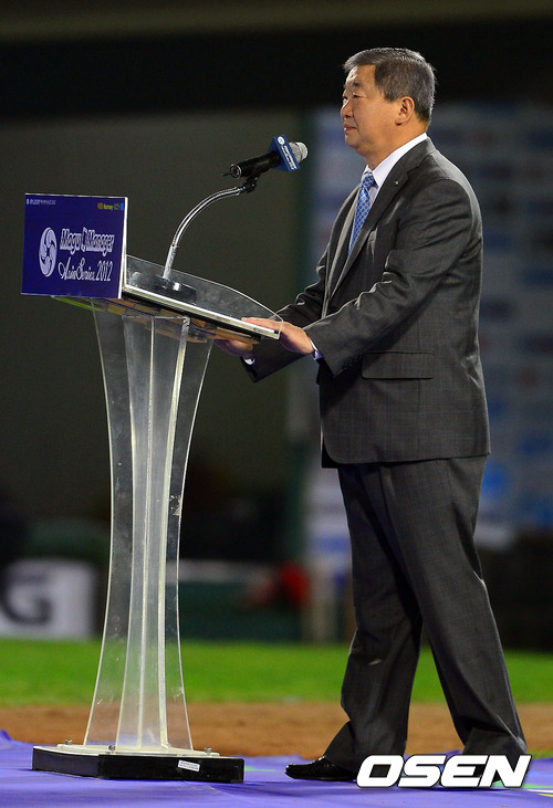 8일 오후 부산 사직구장에서 펼쳐진 '마구마구 매니저 아시아시리즈 2012' 롯데 자이언츠와 퍼스 히트의 경기에 앞서 KBO 구본능 총재가 축사를 하고 있다.