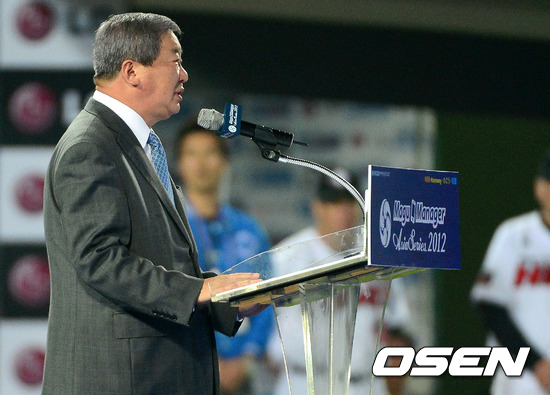 8일 오후 부산 사직야구장에서 열린 '마구매니저 아시아시리즈 2012' 롯데 자이언츠와 퍼스 히트의 경기, 경기에 앞서 공식 개막식에서 구본능 KBO 총재가 개막 선언을 하고 있다.