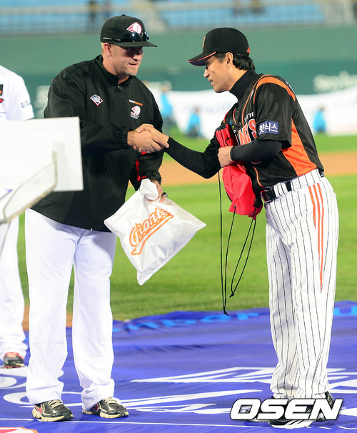 8일 오후 부산 사직야구장에서 열린 '마구매니저 아시아시리즈 2012' 롯데 자이언츠와 퍼스 히트의 경기 시작 전 피쉬 스티브 감독과 권두조 수석코치가 악수를 나누고 있다.