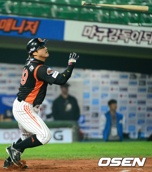 8일 오후 부산 사직야구장에서 열린 '마구매니저 아시아시리즈 2012' 롯데 자이언츠와 퍼스 히트의 경기, 1회초 2사 1루 롯데 홍성흔이 선제 적시타를 치고 있다.