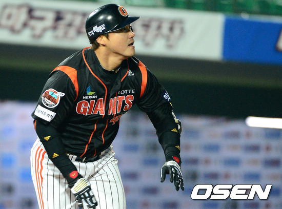 8일 오후 부산 사직야구장에서 열린 '마구매니저 아시아시리즈 2012' 롯데 자이언츠와 퍼스 히트의 경기, 1회초 2사 1루 롯데 홍성흔이 자신의 타구를 바라보고 있다. 홍성흔은 선제 적시타를 기록했다.