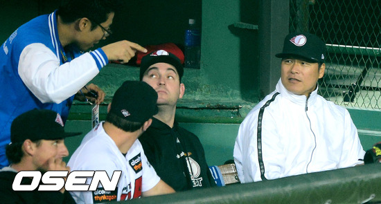 8일 오후 부산 사직야구장에서 열린 '마구매니저 아시아시리즈 2012' 롯데 자이언츠와 퍼스 히트의 경기 2회말 구대성이 덕아웃에서 한 관계자의 이야기를 듣고 있다.