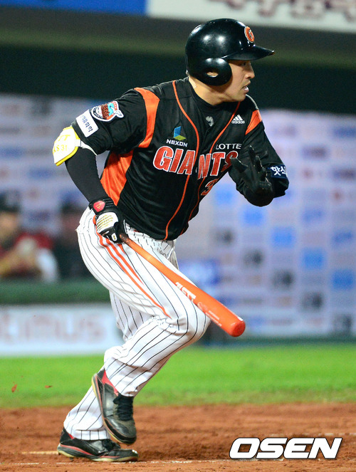 8일 오후 부산 사직야구장에서 열린 '마구매니저 아시아시리즈 2012' 롯데 자이언츠와 퍼스 히트의 경기, 3회초 2사 1루 롯데 손아섭이 중전안타를 치고 있다.