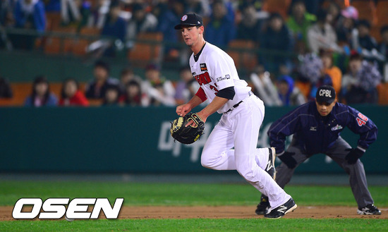 8일 오후 부산 사직구장에서 펼쳐진 '마구마구 매니저 아시아시리즈 2012' 롯데 자이언츠와 퍼스 히트의 경기 4회초 무사 1루 롯데 황재균의 내야안타때 퍼스 히트 1루수 오멘이 평범한 타구를 놓치고 있다.