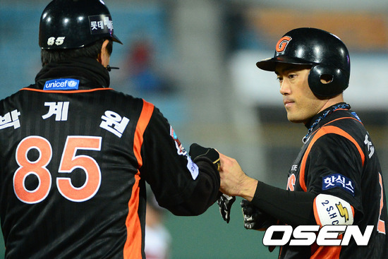 8일 오후 부산 사직야구장에서 열린 '마구매니저 아시아시리즈 2012' 롯데 자이언츠와 퍼스 히트의 경기, 4회초 2사 만루 롯데 조성환이 중전 2타점 적시타를 치고 박계원코치와 하이파이브를 하고 있다.