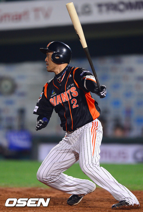 8일 오후 부산 사직구장에서 펼쳐진 '마구마구 매니저 아시아시리즈 2012' 롯데 자이언츠와 퍼스 히트의 경기 4회초 2사 만루 롯데 조성환이 2타점 적시타를 날리고 있다
