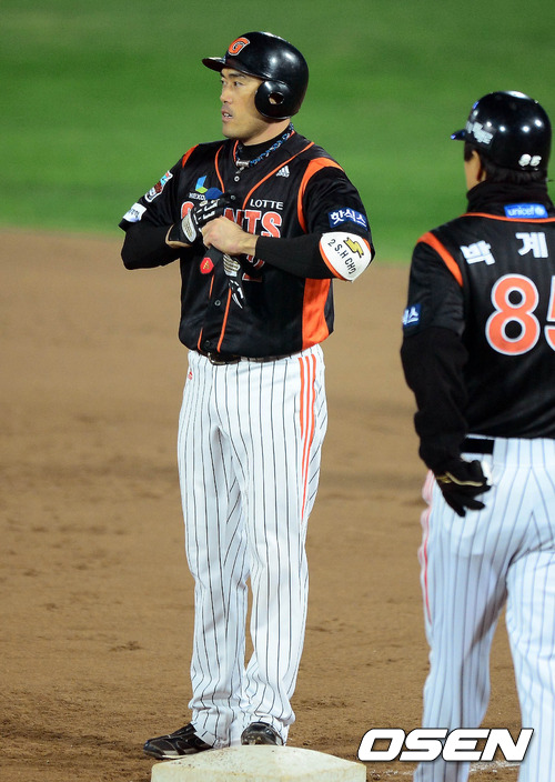 8일 오후 부산 사직야구장에서 열린 '마구매니저 아시아시리즈 2012' 롯데 자이언츠와 퍼스 히트의 경기 4회초 2사 만루 조성환이 2타점 적시타를 치고 1루 베이스에 서 있다.