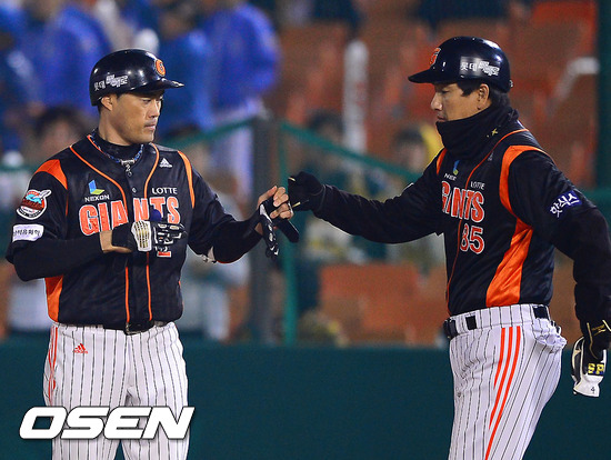 8일 오후 부산 사직구장에서 펼쳐진 '마구마구 매니저 아시아시리즈 2012' 롯데 자이언츠와 퍼스 히트의 경기 4회초 2사 만루 롯데 조성환이 2타점 적시타를 날린후 박계원 코치와 하이파이브를 하고 있다