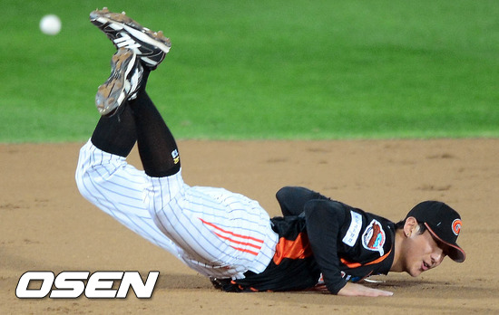8일 오후 부산 사직야구장에서 열린 '마구매니저 아시아시리즈 2012' 롯데 자이언츠와 퍼스 히트의 경기 5회말 1사 벨 카터의 타구를 황재균이 다이빙을 해봤지만, 놓치고 있다.