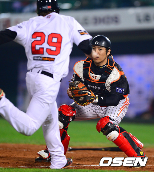 8일 오후 부산 사직구장에서 펼쳐진 '마구마구 매니저 아시아시리즈 2012' 롯데 자이언츠와 퍼스 히트의 경기 5회말 2사 만루 퍼스 히트 범브리의 1타점 적시타때 롯데 강민호 포수가 2루 주자 맥기를 태그아웃시키고 있다