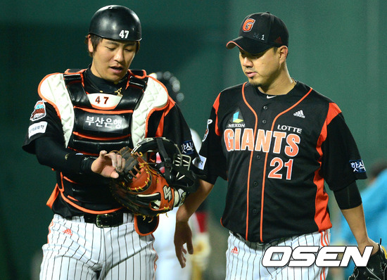 8일 오후 부산 사직야구장에서 열린 '마구매니저 아시아시리즈 2012' 롯데 자이언츠와 퍼스 히트의 경기, 5회말 수비를 마친 롯데 강민호와 송승준이 이야기를 나누며 더그아웃으로 가고 있다.