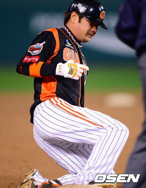 8일 오후 부산 사직구장에서 펼쳐진 '마구마구 매니저 아시아시리즈 2012' 롯데 자이언츠와 퍼스 히트의 경기 6회초 무사 2루 롯데 문규현이 1타점 3루타를 날린후 세이프되고 있다