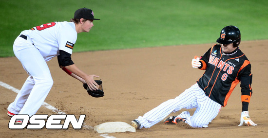 8일 오후 부산 사직야구장에서 열린 '마구매니저 아시아시리즈 2012' 롯데 자이언츠와 퍼스 히트의 경기 6회초 무사 2루 문규현이 1타점 3루타를 치고 3루에서 세이프되고 있다.