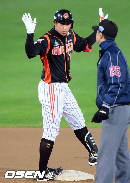 8일 오후 부산 사직야구장에서 열린 '마구매니저 아시아시리즈 2012' 롯데 자이언츠와 퍼스 히트의 경기 6회초 선두타자 황재균이 좌중간 2루타를 치고 2루 베이스에 서 있다.