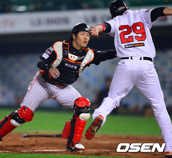 8일 오후 부산 사직구장에서 펼쳐진 '마구마구 매니저 아시아시리즈 2012' 롯데 자이언츠와 퍼스 히트의 경기 5회말 2사 만루 퍼스 히트 범브리의 1타점 적시타때 롯데 강민호 포수가 2루 주자 맥기를 태그아웃시키고 있다