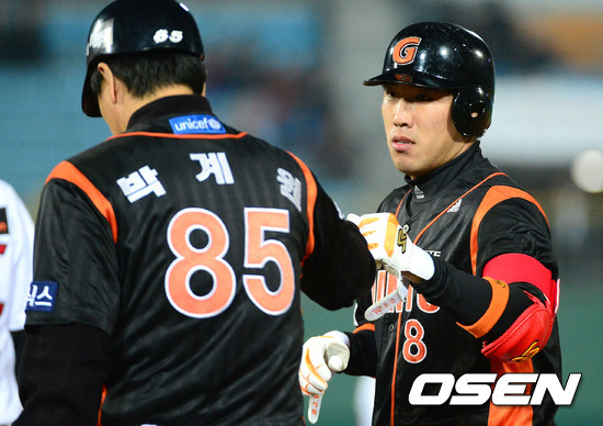 8일 오후 부산 사직야구장에서 열린 '마구매니저 아시아시리즈 2012' 롯데 자이언츠와 퍼스 히트의 경기, 6회초 1사 3루 롯데 전준우가 중전 적시타를 치고 박계원 코치와 하이파이브를 하고 있다.