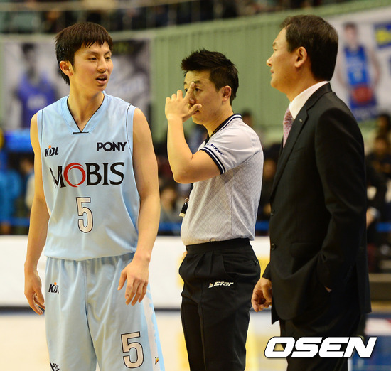 2쿼터 모비스 김시래가 유재학 감독과 이야기를 나누고 있다.