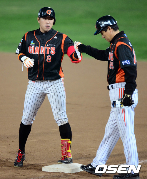 8일 오후 부산 사직야구장에서 열린 '마구매니저 아시아시리즈 2012' 롯데 자이언츠와 퍼스 히트의 경기 6회초 1사 3루 전준우가 1타점 적시타를 치고 박계원 코치와 하이파이브를 하고 있다.