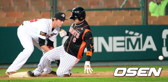 8일 오후 부산 사직야구장에서 열린 '마구매니저 아시아시리즈 2012' 롯데 자이언츠와 퍼스 히트의 경기, 6회초 무사 2루 롯데 문규현이 우전 적시타를 치고 3루에서 세이프되고 있다.