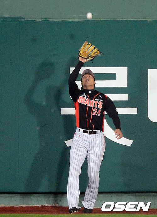 8일 오후 부산 사직야구장에서 열린 '마구매니저 아시아시리즈 2012' 롯데 자이언츠와 퍼스 히트의 경기 6회말 2사 휴즈의 뜬공을 좌익수 김문호가 잡고 있다.
