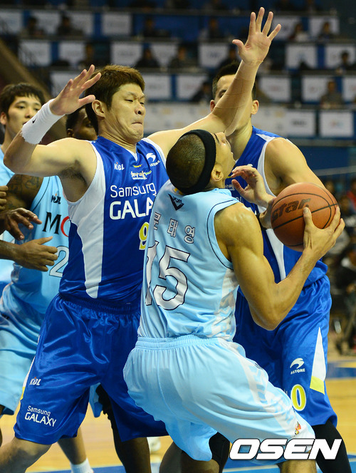 3쿼터 모비스 문태영이 삼성 이규섭의 수비에 막혀 있다.