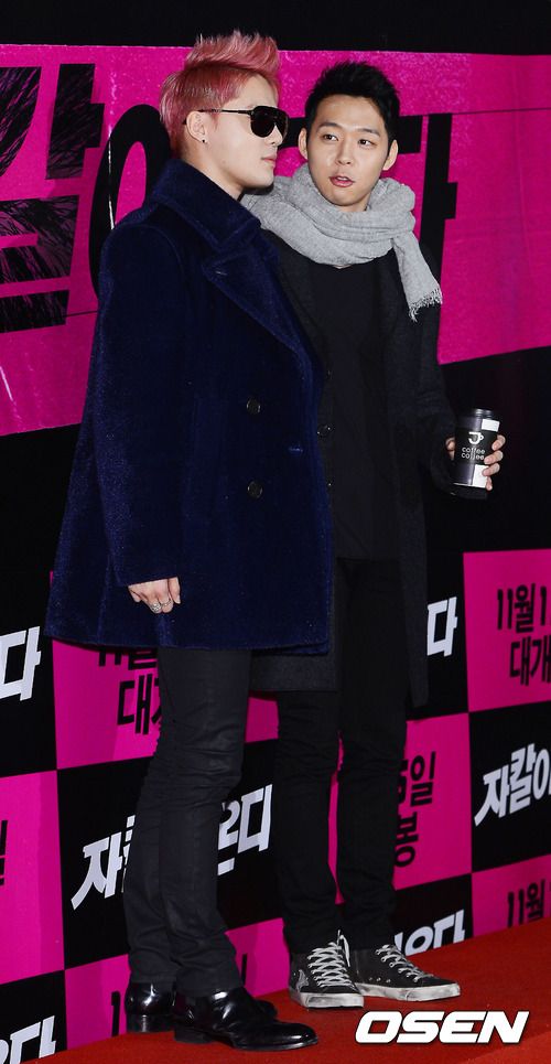 8일 저녁 서울 롯데시네마 건대입구에서 진행된 영화 '자칼이 온다' VIP 시사회에서 JYJ의 김준수와 박유천이 포토월에서 얘기를 나누고 있다.