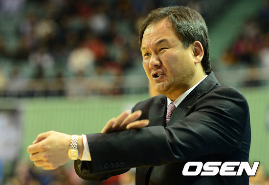 3쿼터 모비스 유재학 감독이 문태영의 슛동작 도중 삼성 이규섭의 파울을 안 불자 손을 쳤다며 불만을 나타내고 있다.