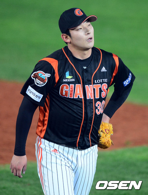 8일 오후 부산 사직야구장에서 열린 '마구매니저 아시아시리즈 2012' 롯데 자이언츠와 퍼스 히트의 경기 7회말을 마친 최대성이 덕아웃으로 향하며 한숨을 쉬고 있다.