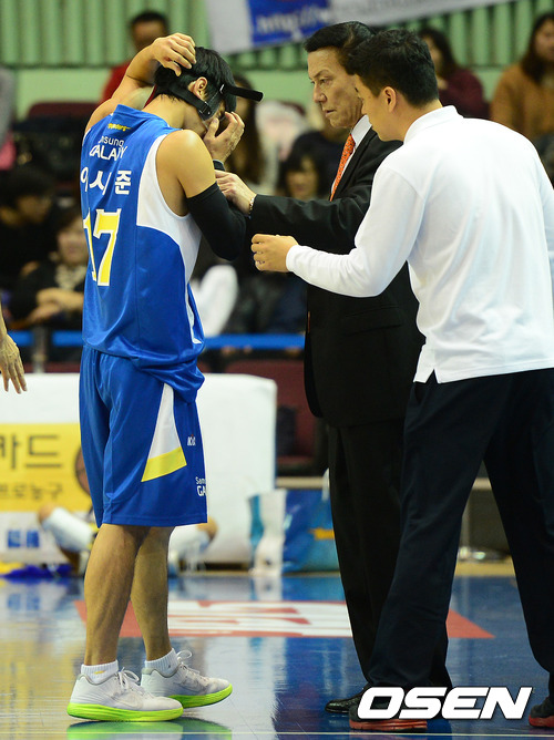 4쿼터 삼성 이시준이 모비스 김시래에 파울을 당하며 얼굴을 가격당하자 김동광 감독이 안타까운 표정으로 바라보고 있다.