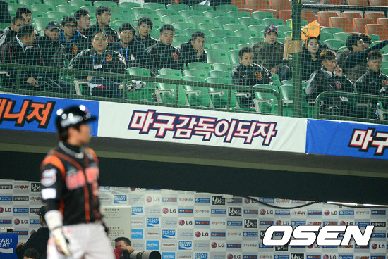 8일 오후 부산 사직야구장에서 열린 '마구매니저 아시아시리즈 2012' 롯데 자이언츠와 퍼스 히트의 경기, 차이나 스타즈 선수들이 관중석에서 경기를 바라보고 있다.