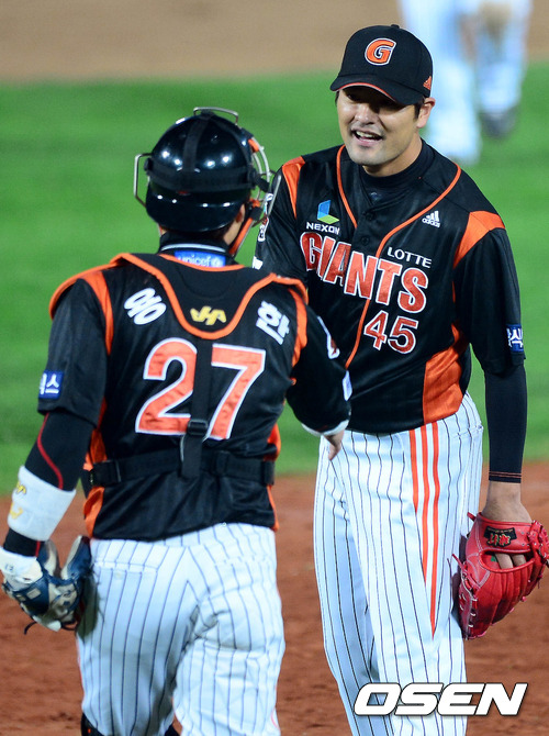 8일 오후 부산 사직야구장에서 열린 '마구매니저 아시아시리즈 2012' 롯데 자이언츠와 퍼스 히트의 경기 종료 후 이정민과 용덕한이 하이파이브를 하고 있다.